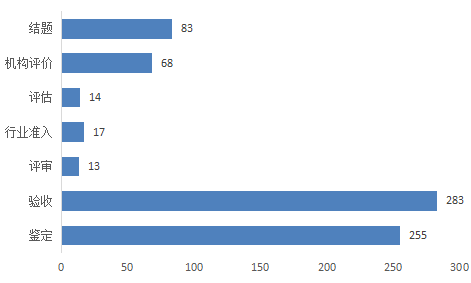 2019年度江蘇科技成果評價仍然以鑒定與驗收為主,其他為輔助模式。其中,鑒定項目255項,占總量的35%;驗收項目283項,占總量的39%;評審項目13項,占總量的2%;行業(yè)準入項目為17項,占2%;評估項目為14項,占2%;機構評價項目為68項,占9%;結題項目83項,占11%。