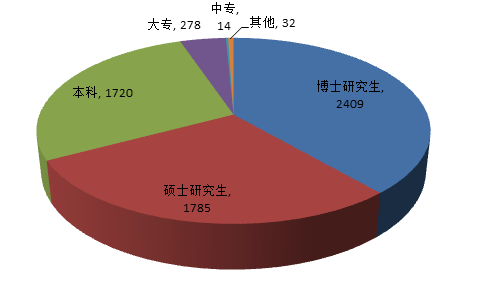 2019年江蘇科技成果完成人的文化程度碩士研究生首次超越了本科,碩士研究生學歷以上的完成人占總完成人數的67%:博士研究生2409人次,碩士研究生1785人次,大學本科1720人次,此外,大專278人次,中專14人次,其他32人次。