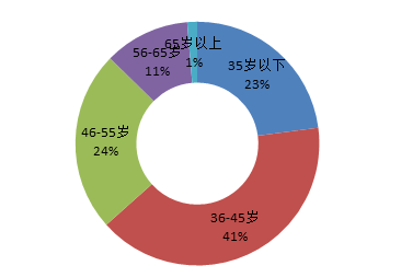 2019年江蘇科技成果完成人的年齡結構以55歲以下為主,其中36-45周歲的成為完成人的主力軍:35歲以下(含35歲)1430人次,占總數的23%;36-45歲2525人次,占總數的40%;46-55歲1492人次,占總數的24%;56-65歲708人次,占總數的11%;65歲以上的83人次。