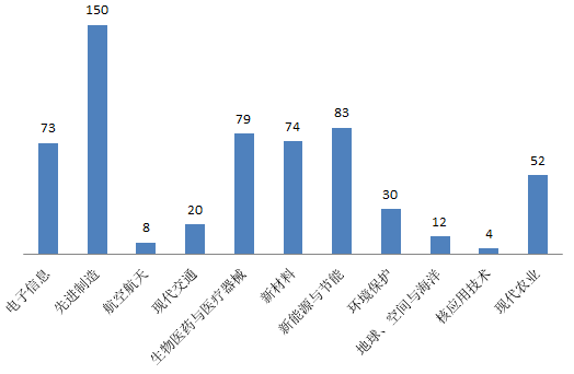 2019年江蘇應用技術成果所屬高新技術領域分布,電子信息73項,先進制造150項,航空航天8項,現代交通20項,生物醫(yī)藥與醫(yī)療器械79項,新材料74項,新能源與節(jié)能83項,環(huán)境保護30項,地球、空間與海洋12項,核應用技術4項,現代農業(yè)52項。