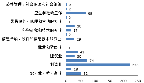 2019年江蘇科技成果應用行業(yè)涉及17個方面,農、林、牧、漁業(yè)52項,采礦業(yè)18項,制造業(yè)223項,電力、熱力、燃氣及水的生產和供應業(yè)74項,建筑業(yè)30項,交通運輸、倉儲和郵政業(yè)41項,批發(fā)和零售業(yè)1項,住宿和餐飲業(yè)2項,信息傳輸、軟件和信息技術服務業(yè)29項,金融業(yè)2項,科學研究和技術服務業(yè)17項,水利、環(huán)境和公共設施管理業(yè)30項,居民服務、修理和其他服務業(yè)1項,教育2項,衛(wèi)生和社會工作69項,文化、體育和娛樂業(yè)2項,公共管理、社會保障和社會組織3項。