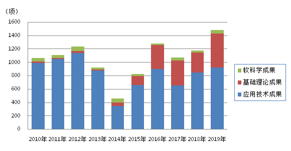 2019年應(yīng)用技術(shù)成果922項,占62.3%,較上年增長9.2%;基礎(chǔ)理論研究成果504項,占34.1%,較上年增長69.7%;軟科學(xué)成果53項,占3.6%,較上年增長51.4%。