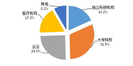 2019年,從完成單位的屬性劃分來看,大專院校466項,占31.5%,較上年提升1.7個百分點;企業(yè)367項,占24.8%,較上年下降7.1個百分點;科研機(jī)構(gòu)269項,占18.2%,較上年下降0.6個百分點;醫(yī)療機(jī)構(gòu)256項,占17.3%,較上年提升5.0個百分點;其他121項,占8.2%,較上年提升1個百分點。