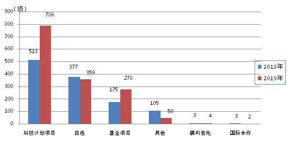 2019年,全省登記的科技成果以各類科技計劃項目為主,政府資金起主導(dǎo)作用,其中來源于各類科技計劃項目的成果786項,較上年增長53.2%,占登記成果總數(shù)的53.1%;自選項目359項,較上年減少4.8%,占24.3%;基金項目278項,較上年增長58.9%,占18.8%;橫向委托4項,較上年增加1項,占0.3%;國際合作2項,較上年減少1項,占0.1%;其他項目50項,較上年減少52.4%,占3.4%。