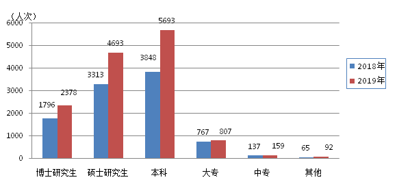從完成人員文化程度分布來看,本科學(xué)歷5693人次,占總?cè)藬?shù)的41.2%;碩士研究生4693人次,占34.0%;博士研究生2378人次,占17.2%;大專807人次,占5.8%;中專及其他共計251人次,占1.8%。從增幅來看,各學(xué)歷人員均有不同程度的增長,其中本科、碩士研究生和博士研究生增幅顯著,分別較上年增長47.9%、41.7%和32.4%。