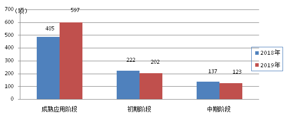 圖7 2018-2019年應(yīng)用技術(shù)成果所處階段對比圖