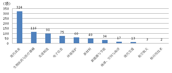統(tǒng)計數(shù)據(jù)顯示,在922項應(yīng)用技術(shù)成果中,有791項屬于高新技術(shù)領(lǐng)域,占到應(yīng)用技術(shù)成果八成以上。我省科技成果共涉及11大類高新技術(shù)領(lǐng)域,其中現(xiàn)代農(nóng)業(yè)、生物醫(yī)藥與醫(yī)療器械、先進(jìn)制造、電子信息、環(huán)境保護(hù)與新材料六大領(lǐng)域的成果占到了全部高新技術(shù)領(lǐng)域的九成以上,特別是現(xiàn)代農(nóng)業(yè)領(lǐng)域達(dá)324項,占41.0%。