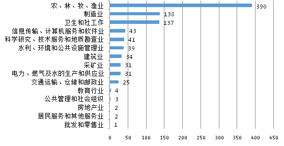 從成果應(yīng)用的國民經(jīng)濟(jì)行業(yè)來看,在922項應(yīng)用技術(shù)成果,廣泛應(yīng)用在16個行業(yè)中,其中,農(nóng)林牧漁業(yè)、制造業(yè)及衛(wèi)生和社會工作三個行業(yè)中科技成果應(yīng)用的最多,科技成果數(shù)量依次為390項、138項和137項,這三個行業(yè)的科技成果占應(yīng)用技術(shù)成果總量的72.1%。