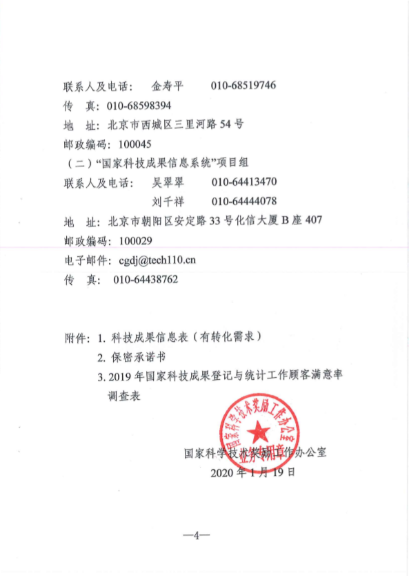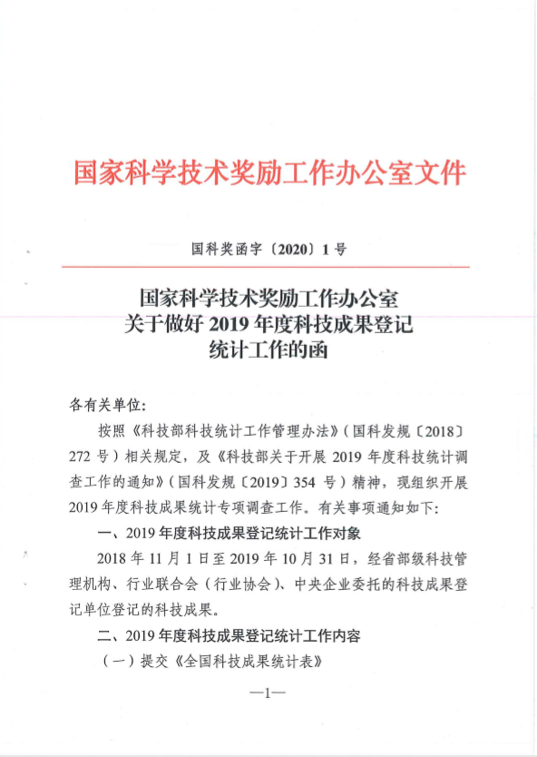 國家科學(xué)技術(shù)獎勵(lì)工作辦公室關(guān)于做好2019年度科技成果登記統(tǒng)計(jì)工作的函