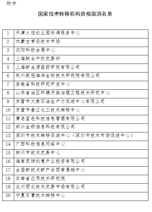 關(guān)于取消天津火炬創(chuàng)業(yè)園協(xié)調(diào)服務(wù)中心等20家國家技術(shù)轉(zhuǎn)移機(jī)構(gòu)資格的通知