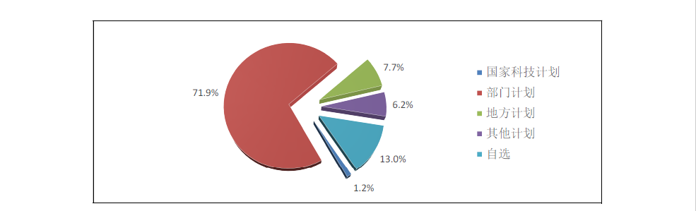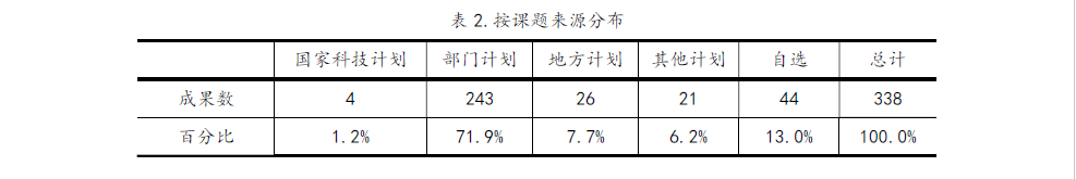 在338項(xiàng)登記成果中,來源于國(guó)家科技計(jì)劃的項(xiàng)目成果占1.2%,部門計(jì)劃項(xiàng)目成果占71.9%,地方計(jì)劃項(xiàng)目成果占7.7%,其他計(jì)劃項(xiàng)目成果占6.2%,自選項(xiàng)目成果占13.0%。鑒于公安部各類科研計(jì)劃項(xiàng)目及由公安部組織申報(bào)的各類國(guó)家科研計(jì)劃項(xiàng)目驗(yàn)收后的成果必須登記,其他成果自愿登記,故部門計(jì)劃項(xiàng)目成果占主要部分(見表2)。
