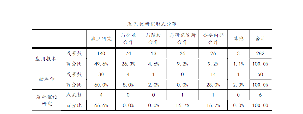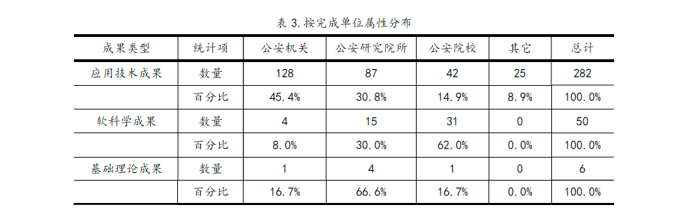 應(yīng)用技術(shù)成果以公安機(jī)關(guān)為主要研究力量,在282項(xiàng)應(yīng)用技術(shù)成果中,第一完成單位為公安機(jī)關(guān)的成果128項(xiàng),占45.4%。軟科學(xué)成果以公安院校為主要研究力量,在50項(xiàng)軟科學(xué)成果中,第一完成單位為公安院校的成果31項(xiàng),占62%;基礎(chǔ)理論研究成果有6項(xiàng)(見表3)。