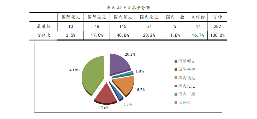 在282項(xiàng)應(yīng)用技術(shù)成果中,“國(guó)際領(lǐng)先”占3.5%,“國(guó)際先進(jìn)”占17.0%,“國(guó)內(nèi)領(lǐng)先”占40.8%,“國(guó)內(nèi)先進(jìn)”占20.2%,“國(guó)內(nèi)一般”占1.8%,“未評(píng)價(jià)”占16.7%(見表5)。