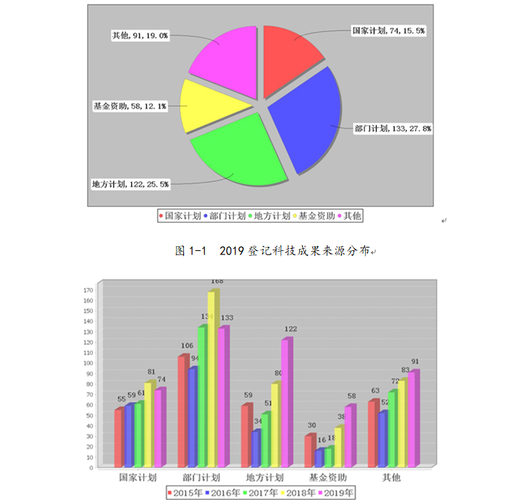 2019年登記的科技成果以部門計劃為主,共計133項,占登記總數(shù)的27.8%,比2018年減少35項。地方計劃122項,占登記總數(shù)的25.5%,比2018年增加42項。國家科技計劃74項(其中,國家自然科學(xué)基金11項,國家科技重大專項8項,國家重點研發(fā)計劃2項,國際科技合作專項1項),占登記總數(shù)的15.5%,比2018年減少7項?;鹳Y助科技成果(除國家基金以外的部門基金、地方基金、民間基金)58項,占登記總數(shù)的12.1%,比2018年增加20項。其他科技成果(包括國際合作、橫向委托和自選等)91項,占登記總數(shù)的19.0%,比2018年增加8項。(見圖1-1、1-2)。