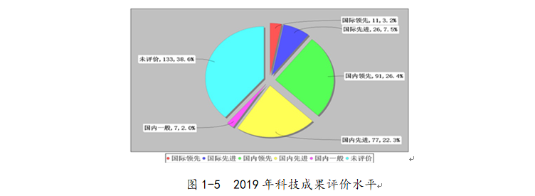 2019年登記的345項應(yīng)用技術(shù)類成果中,水平達到國際領(lǐng)先的成果11項,占3.2%;達到國際先進的成果26項,占7.5%;達到國內(nèi)領(lǐng)先的成果91項,占26.4%;達到國內(nèi)先進的成果77項,占22.3%;達到水平一般的成果7項,占2.0%;未評價的成果133項,占38.6%。(見圖1-5)。