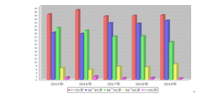 圖1-6 2015~2019年科技成果完成人員年齡結(jié)構(gòu)(%)