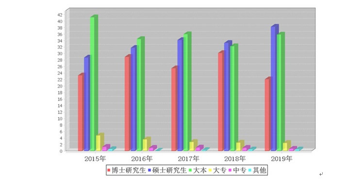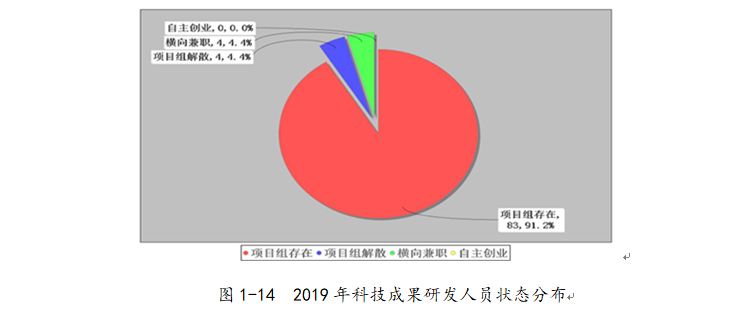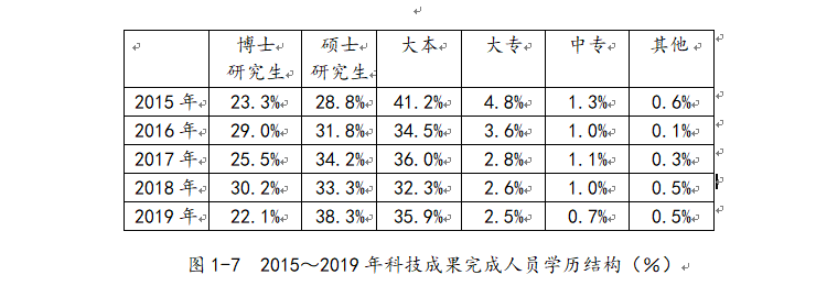 2019年,從學(xué)歷構(gòu)成看,科技成果完成人員主要集中在:碩士研究生,占比38.3%;本科,占比35.9%;博士研究生,占比22.1%。(見圖1-7)。