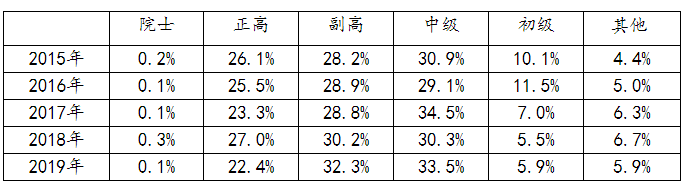 2019年,從職稱構(gòu)成看,主要集中在:中級,占比33.5%;副高,占比32.3%;正高,占比22.4%。(見圖1-8)。
