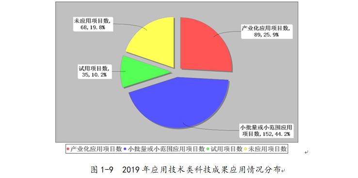 登記的應(yīng)用技術(shù)類科技成果中,小批量或小范圍應(yīng)用項目數(shù)的科技成果保持著較高的比例,為152項,占41.8%;產(chǎn)業(yè)化應(yīng)用項目數(shù)項目為89項,占24.5%;未應(yīng)用項目數(shù)項目為68項,占18.7%;試用項目數(shù)項目為35項,占9.6%;已轉(zhuǎn)化項目數(shù)項目為19項,占5.2%;應(yīng)用后停用項目數(shù)項目為1項,占0.3%(見圖1-9)。從總體上看,成果未應(yīng)用的主要原因是管理問題和政策因素,分別占41.5%和20.0%;其次是技術(shù)問題、市場問題和資金問題,分別占18.5%、10.8%和9.2%。