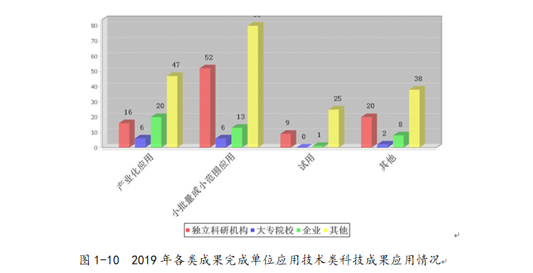 從穩(wěn)定應(yīng)用成果在各單位應(yīng)用技術(shù)成果登記中所占比例來看,獨立科研機構(gòu)、大專院校、企業(yè)、其他單位分別為16.5%、42.9%、47.6%、24.6%,穩(wěn)定應(yīng)用成果比重均比較高。其次為小批量應(yīng)用項目,分別為53.6%、42.9%、31.0%、41.9%。再次為試用項目,分別為9.3%、0.0%、2.4%、13.1%。(見圖1-10)。