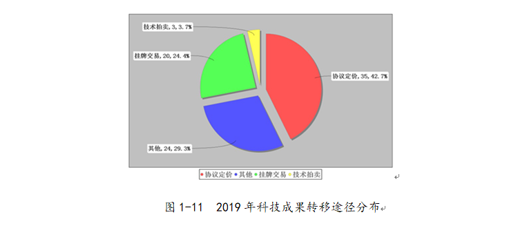 從成果轉(zhuǎn)移途徑來看,通過協(xié)議定價方式轉(zhuǎn)化的成果35項,占42.7%;通過其他方式轉(zhuǎn)化的成果24項,占29.3%;通過掛牌交易方式轉(zhuǎn)化的成果20項,占24.4%;通過技術(shù)拍賣方式轉(zhuǎn)化的成果3項,占3.7%(見圖1-11)。