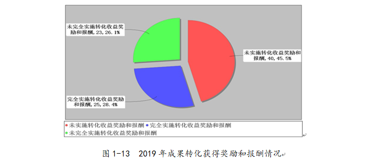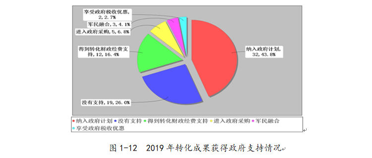 從轉(zhuǎn)化成果獲得的政府支持情況來看:32項成果納入政府計劃,占43.8%;19項成果沒有支持,占26.0%;12項成果得到轉(zhuǎn)化財政經(jīng)費支持,占16.4%;5項成果進入政府采購,占6.8%;3項成果軍民融合,占4.1%;2項成果享受政府稅收優(yōu)惠,占2.7%(見圖1-12)。