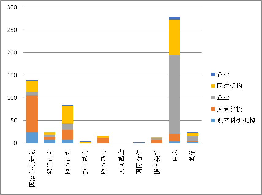 據(jù)統(tǒng)計,登記成果第一完成單位分布主要集中在企業(yè)。其中企業(yè)完成的項目占總項目的36.90%,其中自選課題中企業(yè)完成項目占總項目的62.37%,醫(yī)療機(jī)構(gòu)自選完成的項目為78項,占總項目的27.96%。(見圖2)。