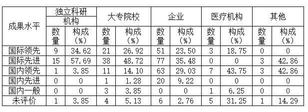 據(jù)統(tǒng)計,2019年成果完成單位中,企業(yè)成果評價水平相對較高,其國際先進(jìn)水平以上成果達(dá)到51項,明顯高于其他類成果完成單位。(見表3)