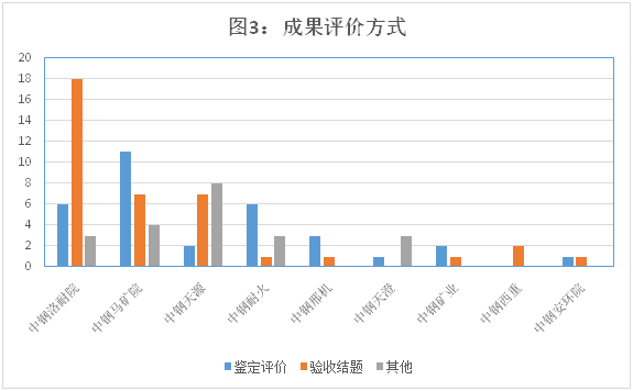 2019年中鋼集團登記入庫的科技成果,其評價方式以鑒定評價和驗收結(jié)題為主、其他評價方式并存。其中,鑒定評價多為外部權(quán)威機構(gòu)評價;驗收結(jié)題一般是承擔(dān)國家、省部級計劃的課題組組織評價或本企業(yè)借助專家組評審組織評價。各所屬企業(yè)成果評價方式見下圖3。