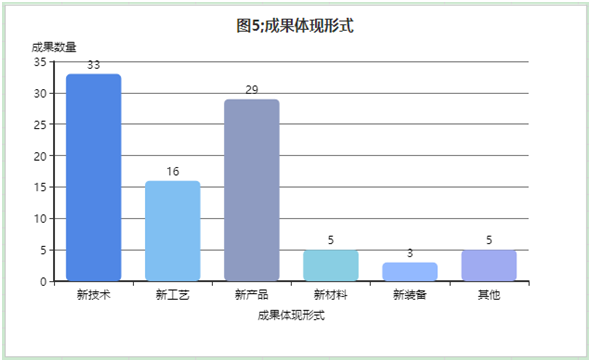2019年中鋼集團登記入庫的科技成果,主要有新技術(shù)、新工藝、新產(chǎn)品、新材料、新裝備、其他等6種體現(xiàn)形式,其中以新技術(shù)、新產(chǎn)品、新工藝為主,這三種體現(xiàn)形式占比達85.7%(如下圖5所示)。其他類中主要為基礎(chǔ)理論類成果以論文或研究報告的形式體現(xiàn)。