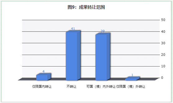 2019年中鋼集團登記入庫的應(yīng)用技術(shù)類成果,已完成轉(zhuǎn)化26項,實現(xiàn)轉(zhuǎn)化經(jīng)濟收入30.1億元。主要以自我轉(zhuǎn)化、合作轉(zhuǎn)化、技術(shù)轉(zhuǎn)讓或許可、其他轉(zhuǎn)化四種方式轉(zhuǎn)化,其中自我轉(zhuǎn)化占比達67.44%,詳見圖7。成果轉(zhuǎn)化范圍以不轉(zhuǎn)讓和可國(境)內(nèi)外轉(zhuǎn)讓為主,詳見圖8。入庫成果已獲授權(quán)專利255項,正在辦理授權(quán)專利46項。多年來中鋼集團所屬企業(yè)不斷加強具有自主知識產(chǎn)權(quán)的高新技術(shù)及產(chǎn)品的研發(fā),并以科技成果轉(zhuǎn)化推動新產(chǎn)品新技術(shù)數(shù)量提升,推動企業(yè)經(jīng)營收益逐步增加。