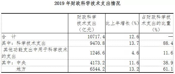 2019年,國家財(cái)政科學(xué)技術(shù)支出10717.4億元,比上年增加1199.2億元,增長12.6%。其中,中央財(cái)政科學(xué)技術(shù)支出4173.2億元,增長11.6%,占財(cái)政科學(xué)技術(shù)支出的比重為38.9%;地方財(cái)政科學(xué)技術(shù)支出6544.2億元,增長13.2%,占比為61.1%。
