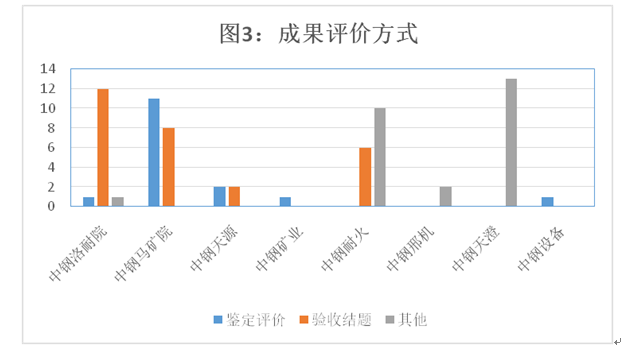 2020年中鋼集團登記入庫的科技成果,其評價方式以鑒定評價、驗收結(jié)題、其他評價方式為主。其中,鑒定評價多為外部權(quán)威機構(gòu)評價;驗收結(jié)題一般是承擔(dān)國家、省部級計劃的課題組組織評價或本企業(yè)借助專家組評審組織評價。各所屬企業(yè)成果評價方式見下圖3。