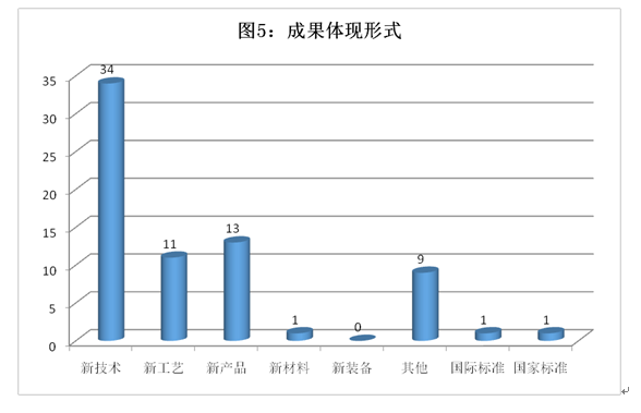 2020年中鋼集團登記入庫的科技成果,主要有新技術(shù)、新工藝、新產(chǎn)品、新材料、其他、國際標(biāo)準(zhǔn)、國家標(biāo)準(zhǔn)等7種體現(xiàn)形式,其中以新技術(shù)、新產(chǎn)品、新工藝為主,這三種體現(xiàn)形式占比達(dá)82.9%(如下圖5所示)。其他類中主要為基礎(chǔ)理論類、軟科學(xué)類成果以論文或研究報告的形式體現(xiàn)。