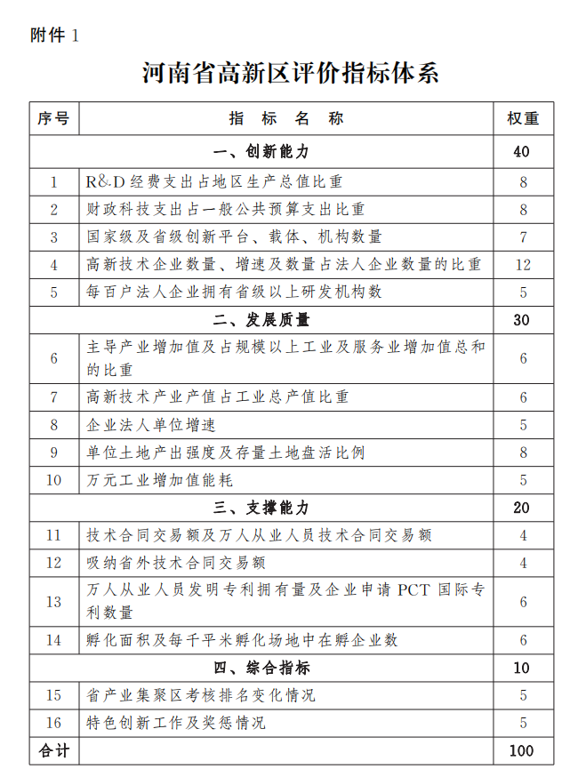 第十條 評價指標體系包括創(chuàng)新能力、發(fā)展質(zhì)量、支撐能力、綜合指標4個一級指標、16個二級指標,評價指標總權(quán)數(shù)100,對應(yīng)總分數(shù)100分。