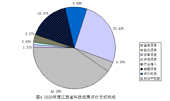 2020年度江西省登記的成果評價方式以驗收為主,機構評價、結題為輔,鑒定及其他評價方式并存。登記成果中驗收項目431項,占登記成果總數(shù)的40.28%,;機構評價項目93項,占8.69%,結題項目172項,占16.07%;知識產權授權項目272項,占25.42%;鑒定、評審、評估、行業(yè)準入等其他評價方式項目102項,占9.53%(見圖4)。