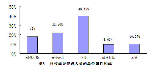 2020年度登記的科技成果涉及到的完成人員共7396人次。以單位屬性看,企業(yè)和大專院校的科技人員最多。其中,企業(yè)科技人員2967人次,占40.12%;大專院校人員1641人,占22.19%;醫(yī)療機構712人,占9.63%;科研機構科技人員1331人,占18%;其他745人,占10.07%(見圖8)。