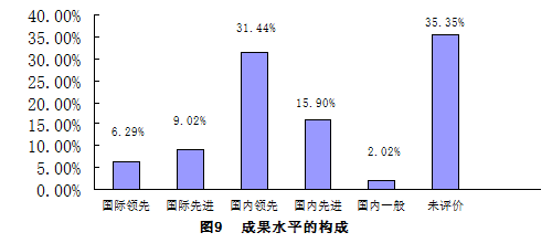 在2020年全省登記的843項應用技術成果中,達到國際領先水平項目53項,占應用技術成果總數(shù)的6.29%;達到國際先進水平的76項,占9.02%;達到國內領先和國內先進水平的成果399項,占47.33%;國內一般水平的成果17項,占2.02%。未評價成果298項,占35.35%。國內先進水平以上的項目占總數(shù)的62.64%以上。(見圖9)。