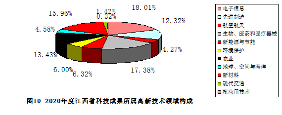 2020年度江西省登記的843項應用技術成果中,有633項屬高新技術領域,占登記的科技成果總數(shù)的59.16%。其中,電子信息114項,占所登記的高新技術領域成果總量的18.01%;先進制造78項,占12.32%;航空航天27項,占4.27%;現(xiàn)代交通9項,占1.42%;生物醫(yī)藥和醫(yī)療器械110項,占17.38%;新材料101項,占15.96%;新能源與節(jié)能40項,占6.32%;環(huán)境保護38項,占6.0%;地球、空間與海洋29項,占4.58%;核應用技術2項,占0.32%;現(xiàn)代農業(yè)85項,占13.43%。電子信息領域在全省高新技術領域中所占比例最高,其次生物醫(yī)藥、新材料和農業(yè)也都占有較大比例( 見圖10)。