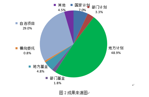 在399項(xiàng)登記的科技成果中,屬于政府項(xiàng)目成果(來(lái)源于國(guó)家計(jì)劃、地方計(jì)劃、部門計(jì)劃、地方基金和部門基金的成果)262項(xiàng),占65.7%,比2019年提高了10.3個(gè)百分點(diǎn),其中國(guó)家科技計(jì)劃28項(xiàng),占7.0%;地方計(jì)劃195項(xiàng),占48.9%;部門計(jì)劃13項(xiàng),占3.3%;地方基金19項(xiàng),占4.8%;部門基金7項(xiàng),占1.8%(見(jiàn)圖2)。地方計(jì)劃項(xiàng)目產(chǎn)生的科技成果占比較上年提高了17.6個(gè)百分點(diǎn),增長(zhǎng)較快;社會(huì)項(xiàng)目成果(來(lái)源于國(guó)際合作、橫向委托、民間基金、自選課題及其他來(lái)源的成果)占34.3%,比2019年降低了10.3個(gè)百分點(diǎn)。
