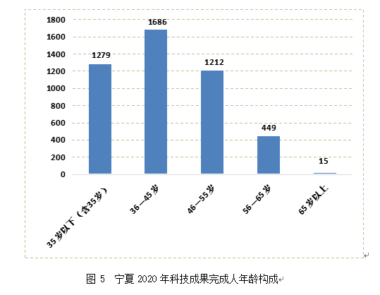 從年齡結(jié)構(gòu)來(lái)看,中青年是科技成果研究人員的主體,55歲以下占90.0%,其中45歲以下2965人次,占總?cè)藬?shù)的比重接近2/3,46-55歲1212人次,占比超過(guò)1/4,與2019年相比,科技成果完成人年齡結(jié)構(gòu)變化不大,與全國(guó)平均水平相比,寧夏的科技成果完成人更趨于年輕化。