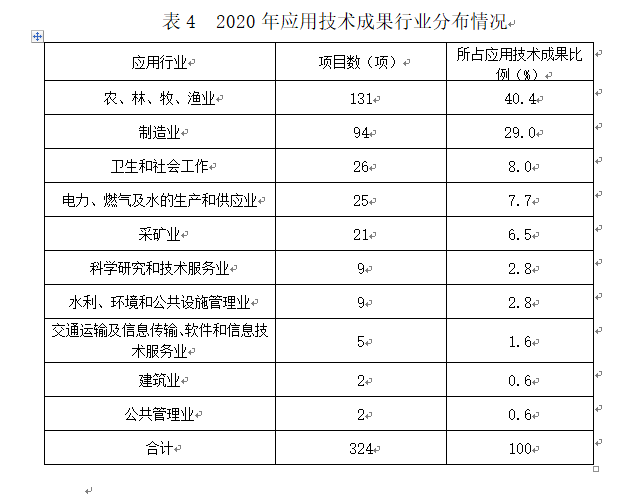 324項(xiàng)應(yīng)用技術(shù)成果按行業(yè)分布,農(nóng)、林、牧、漁業(yè)131項(xiàng)、制造業(yè)94項(xiàng)、衛(wèi)生和社會(huì)工作26項(xiàng)、電力、燃?xì)饧八纳a(chǎn)和供應(yīng)業(yè)25項(xiàng)、采礦業(yè)21項(xiàng)、科學(xué)研究和技術(shù)服務(wù)業(yè)9項(xiàng)、水利、環(huán)境和公共設(shè)施管理業(yè)9項(xiàng)、交通運(yùn)輸及信息傳輸、軟件和信息技術(shù)服務(wù)業(yè)5項(xiàng)、建筑業(yè)2項(xiàng)、公共管理業(yè)2項(xiàng)(見(jiàn)表4)。數(shù)據(jù)表明,我區(qū)科技成果主要分布在農(nóng)林牧漁業(yè),制造業(yè),衛(wèi)生和電力熱力燃?xì)夤?yīng)等行業(yè)。