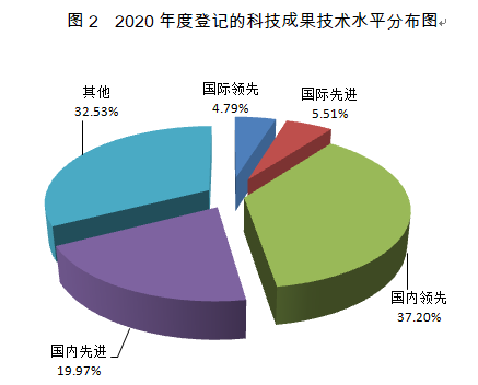 2020年度河南省登記的2524項(xiàng)科技成果中,達(dá)到國際領(lǐng)先水平的項(xiàng)目121項(xiàng),占全部成果的4.79%;達(dá)到國際先進(jìn)水平的項(xiàng)目139項(xiàng),占全部成果的5.51%;達(dá)到國內(nèi)領(lǐng)先水平的項(xiàng)目939項(xiàng),占全部成果的37.20%;達(dá)到國內(nèi)先進(jìn)水平的項(xiàng)目504項(xiàng),占全部成果的19.97%,其他項(xiàng)目共821項(xiàng),占全部成果的32.53%。