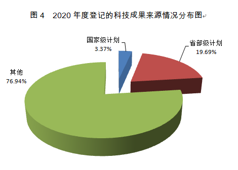 2020年度河南省登記的2524項(xiàng)成果中,來自國家級(jí)計(jì)劃項(xiàng)目的有85項(xiàng),占3.37%,來自省部級(jí)計(jì)劃項(xiàng)目的497項(xiàng),占19.69%,其他類項(xiàng)目1942項(xiàng),占76.94%。