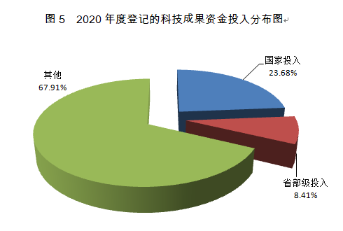2020年度河南省登記的2524項(xiàng)成果中,共投入資金69.0028億元,其中國家投入16.3424億元,占23.68%;省部級(jí)投入5.8001億元,占8.41%;其他資金投入46.8603億元,占67.91%。項(xiàng)目資金投入主要來自于項(xiàng)目承擔(dān)單位。