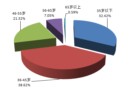 項(xiàng)目完成人中35歲以下人員6980人,占32.42%;36-45歲人員8316人,占38.62%;46-55歲人員4591人,占21.32%;56-65歲人員1517人,占7.05%;65歲以上人員127人,占0.59%。