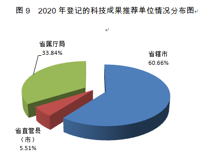 2020年度河南省登記的2524項(xiàng)成果中,省轄市推薦的1531項(xiàng),占60.66%;省直管縣(市)推薦的139項(xiàng),占5.51%;省屬廳局推薦的854項(xiàng),占33.84%。