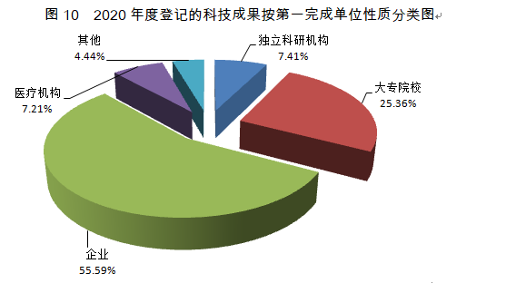 2020年度河南省登記的2524項(xiàng)成果中,獨(dú)立科研機(jī)構(gòu)完成的187項(xiàng),占7.41%;大專院校完成的640項(xiàng),占25.36%;企業(yè)完成的1403項(xiàng),占55.59%;醫(yī)療機(jī)構(gòu)完成的182項(xiàng),占7.21%;其他性質(zhì)單位完成的112項(xiàng),占4.44%。