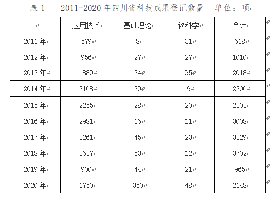 2020年四川省科技成果登記2148項(xiàng),同比增長(zhǎng)122.59%,其中部門登記成果1040項(xiàng),市(州)登記成果1108項(xiàng)。