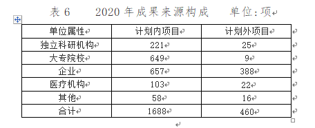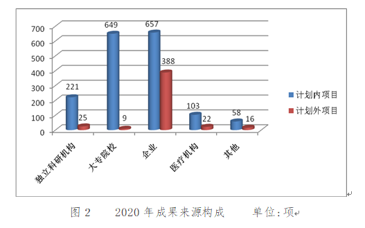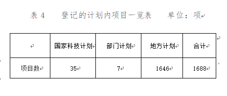 2020年登記科技成果來自于國(guó)家、部門和地方科技計(jì)劃支持產(chǎn)生的成果1688項(xiàng),占登記成果的78.58%;計(jì)劃外460項(xiàng),占登記成果的21.42%。